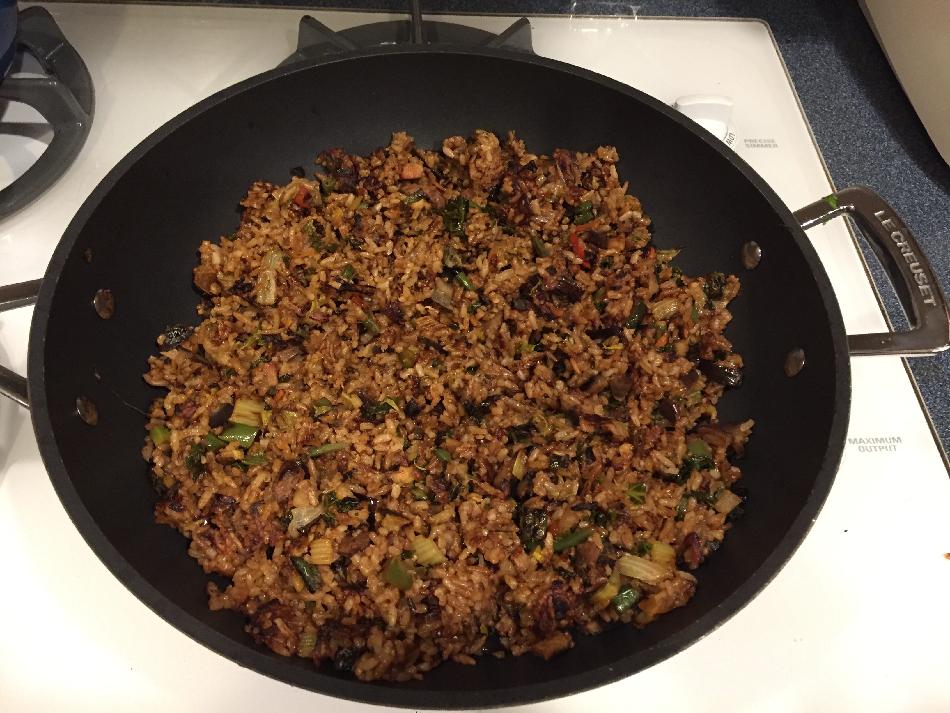 TOP PHOTO: Ingredients for Zen Fried Rice, chopped, sorted and organized. BELOW: Truly fried rice, browned and crunchy in the wok.