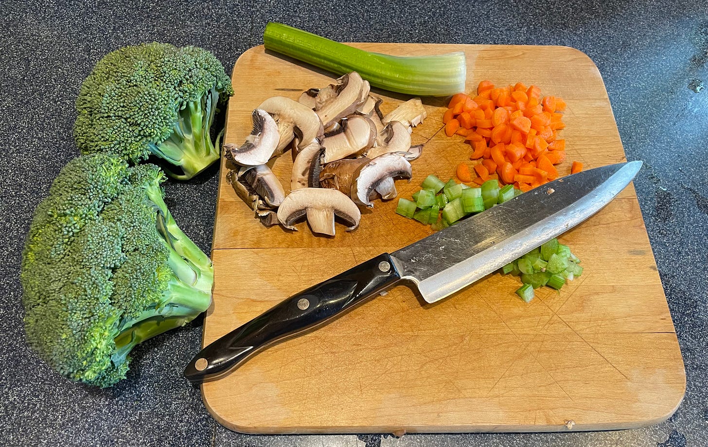 It doesn’t matter what order you chop ingredients, but — as with many things in life — it’s important to organize them. Old carrots go in one pile, broccoli stems in another, leftover eggplant in a third and so on.